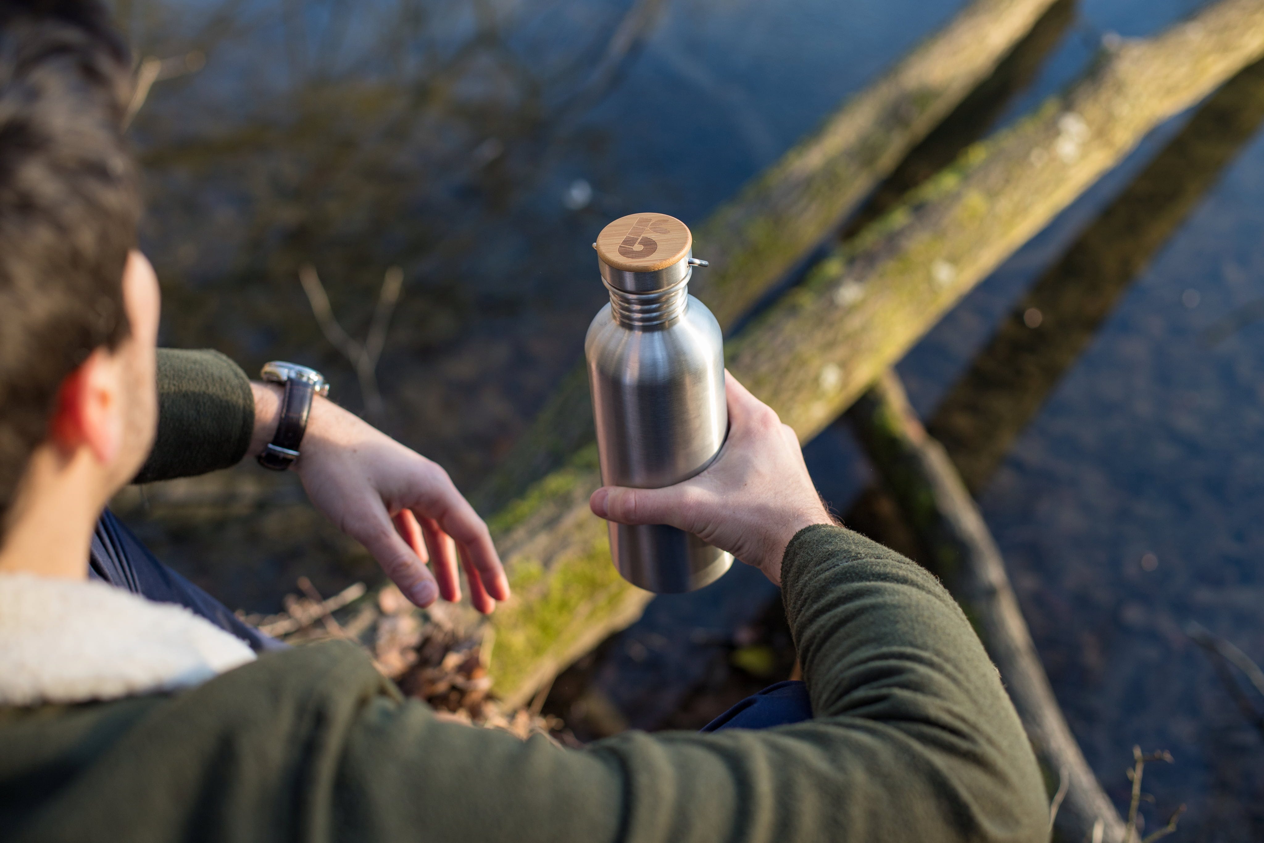 - À un design sobre et contemporain, son corps est composé d'acier inoxydable et elle est dotée d’un bouchon en bambou.